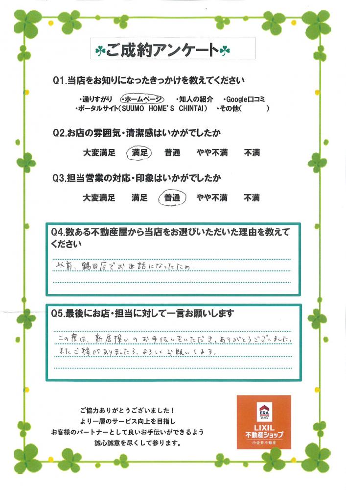この度は、新居探しのお手伝いをいただき、ありがとうございました。